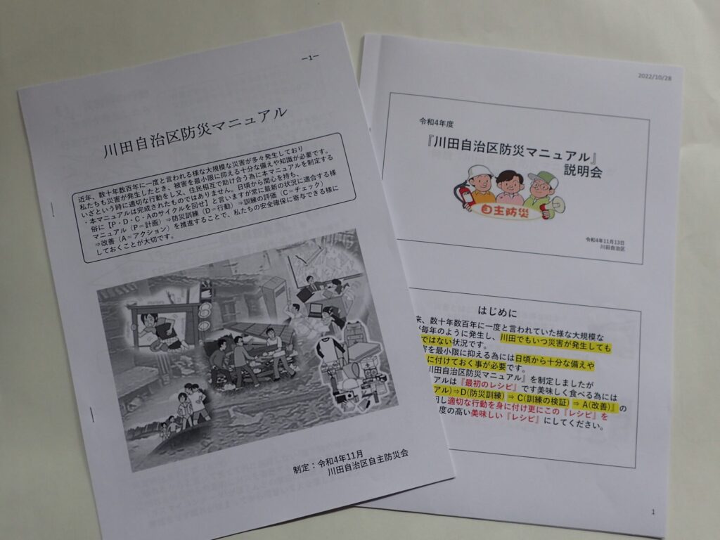 「川田地区の災害リスク、川田自治区の現状と課題」を踏まえ防災マニュアルが作成されています。